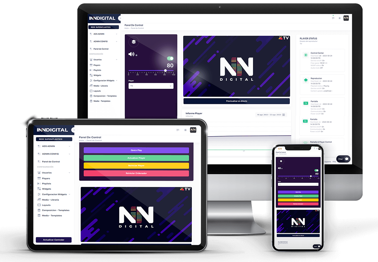INNDIGITAL software es la elección perfecta para su solución de señalización digital. Sin importar si usted quiere participar, informar o educar podemos atender a las necesidades de cada cliente con nuestro software flexible. Con IINNDIGITAL podrá elegir libremente la forma de utilizar su sistema y la opción de pago, que mejor se ajuste a su presupuesto.
